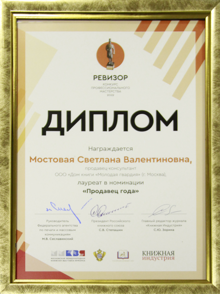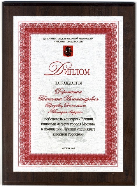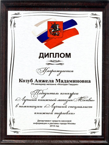Победитель конкурса «Лучший книжный магазин города Москвы» в 2014 году Дом Книги "Молодая гвардия" в номинации "Лучший специалист книжной торговли"